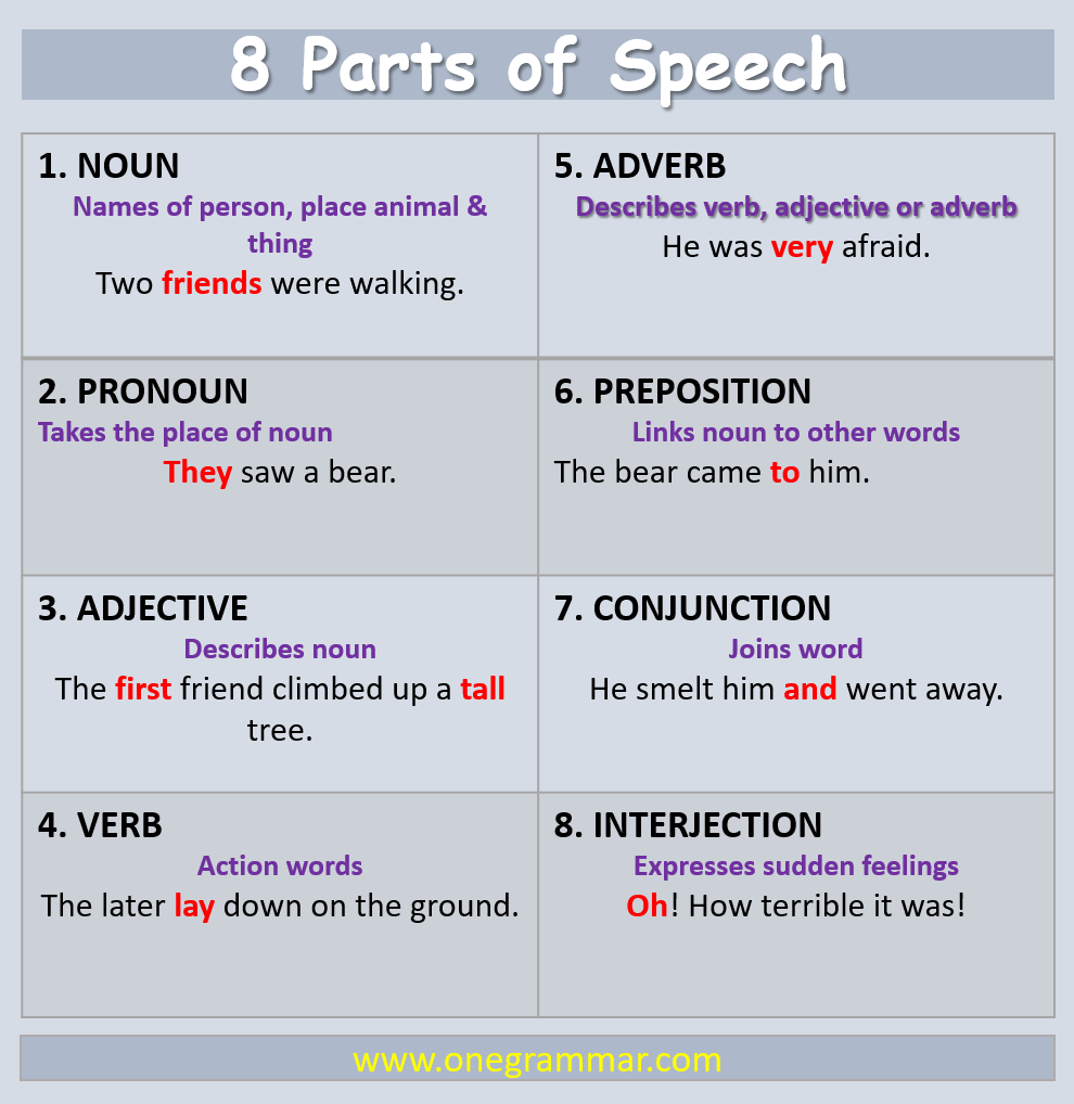 In traditional grammar, there are eight parts of speech: